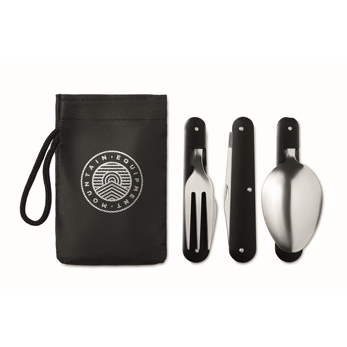 Camping cutlery set in stainless steel with aluminium handle. Combination spoon, fork and knife supplied in black pouch.