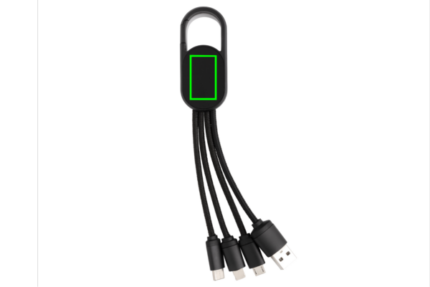 4 in 1 charging cable with carabiner. USB input plug and for output: double-sided connector for IOS devices, micro USB and type C output. Suitable for charging all common mobile devices. ABS material casing with 10 cm long nylon braided cables. Supports up to 2.1A charging.