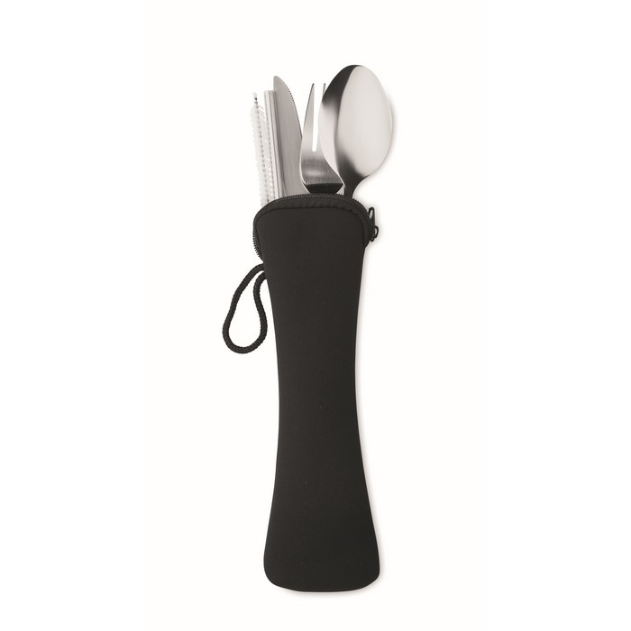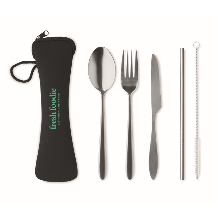 Re-usable stainless steel cutlery set including fork, knife, spoon, straw and brush in neoprene pouch.