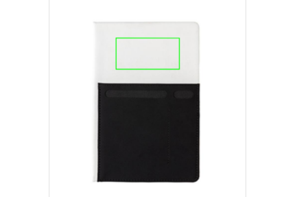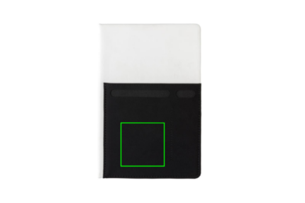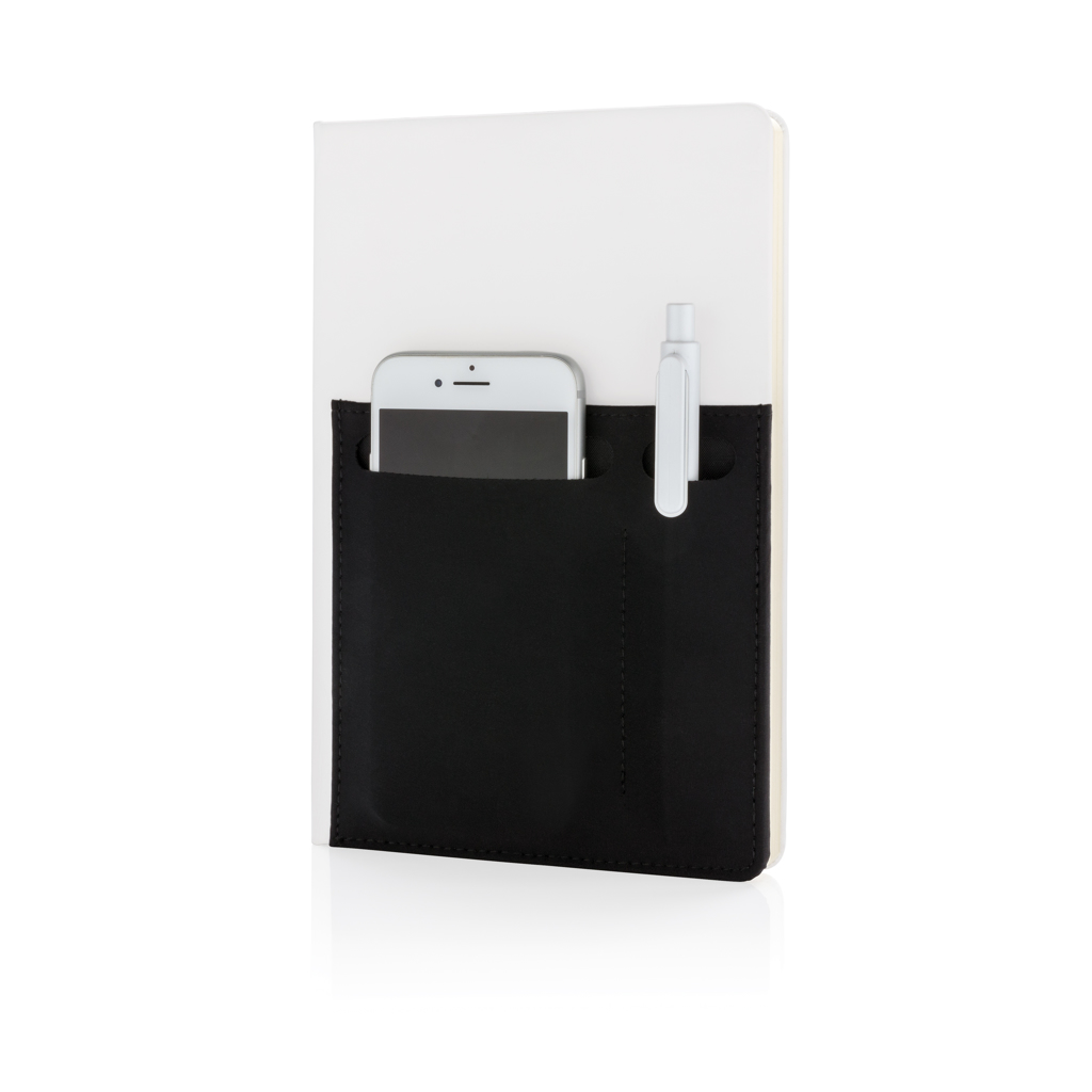 A5 notebook with 160 cream coloured lined pages of 80g/m2 paper inside. Front cover has a flexible phone pocket, pen pocket and larger sleeve pocket for documents. Phone pocket is 8cm wide which fits iPhone 7 plus.