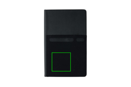 A5 notebook with 160 cream coloured lined pages of 80g/m2 paper inside. Front cover has a flexible phone pocket, pen pocket and larger sleeve pocket for documents. Phone pocket is 8cm wide which fits iPhone 7 plus.