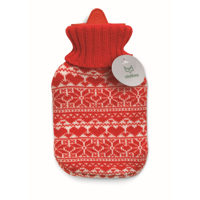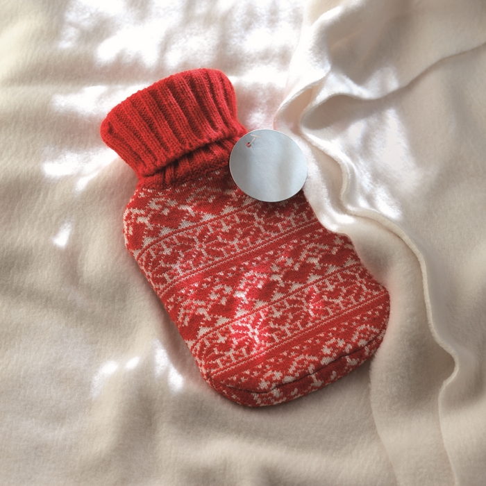 Hot water bottle with jersey in Nordic design. Used to provide warmth, typically whilst in bed, but also for the application of heat to a specific part of the body. 310 ml capacity.