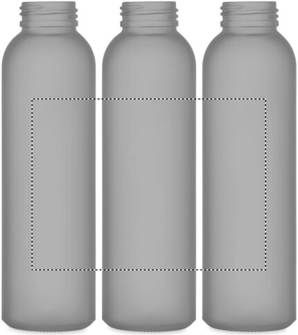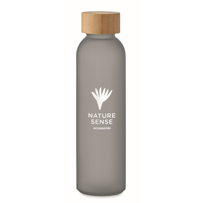 Glass bottle with frosted finish and bamboo lid. Leak-free. Capacity: 500 ml. Bamboo is a natural product, there may be slight variations in colour and size per item, which can affect the final decoration outcome.