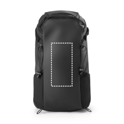 Hiking-style backpack for everyday use in urban environments, adventures or outdoor sports. The functional design combined with the quality and resistance of the materials make this backpack a unique product. Made from 600D PET (100% rPET) with a waterproof coating. The backpack consists of 1 main compartment with a multifunction pocket in 210D PET (100% rPET), 1 separate fully padded compartment for a laptop up to 14″ and mesh side pockets. The top pocket has a zip fastener. This backpack has special features such as multifunctional belt loops, weight control straps, chest strap. Capacity up to 18 litres. 280 x 455 x 160 mm