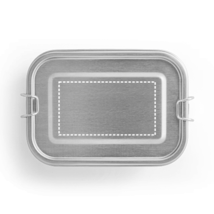 Robust hermetic box made of 90% stainless steel (90% recycled) with side safety buckles. Capacity up to 750 mL. Supplied in a Kraft paper gift box. 170 x 119 x 57 mm