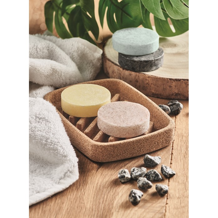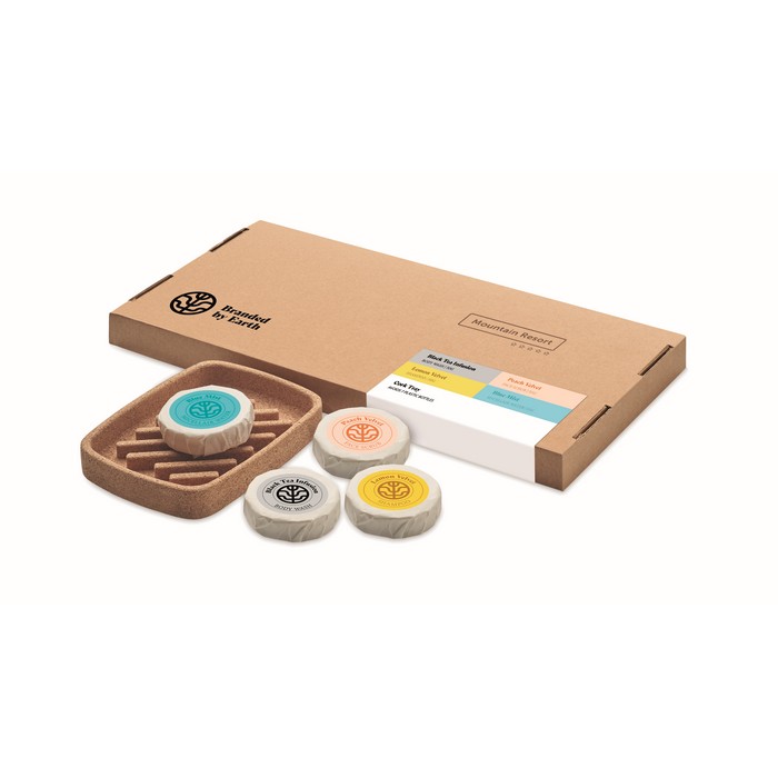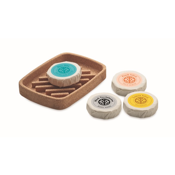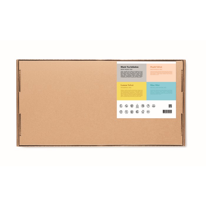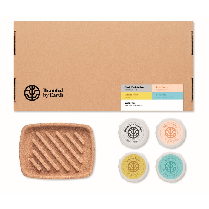 Unisex beauty gift set by Branded By Earth. Includes vegan 50gr of body wash, shampoo, face scrub, micellar water bag and a cork soap tray. All pieces wrapped in paper. Presented in recycled paper box. Made in EU.