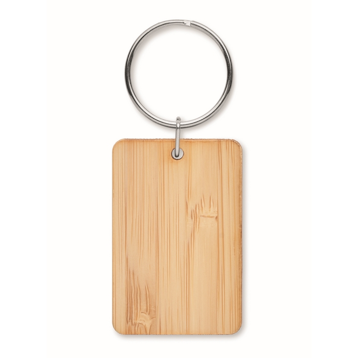 Rectangular bamboo key ring. Bamboo is a natural product, there may be slight variations in colour and size per item, which can affect the final decoration outcome.