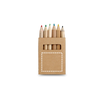 Colouring set supplied in a Kraft paper box. This set includes 6 colouring pencils, 1 sharpener and 15 cards with drawings to colour. 73 x 89 x 12 mm