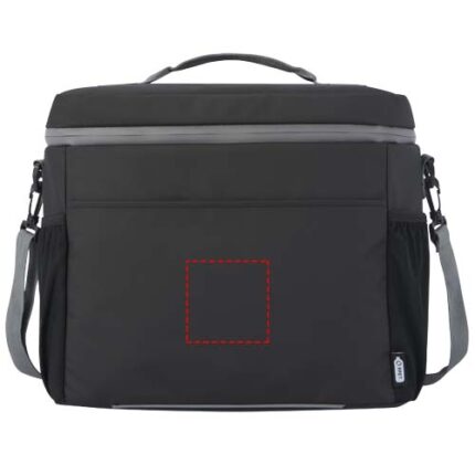 Water-resistant 20-can cooler bag made from GRS certified recycled materials, including the zips. It features a spacious zippered compartment lined with food-safe and extra thick high density thermal PEVA and foam insulation, keeping beverages and refreshments cold for hours. It also has 2 mesh pockets and one open front pocket for additional storage. The webbing carrying handle and the adjustable and padded shoulder strap makes it comfortable to carry around. The GRS recycled materials include the main fabric, lining, webbing, and zips. Capacity: 22 litres. PVC free.