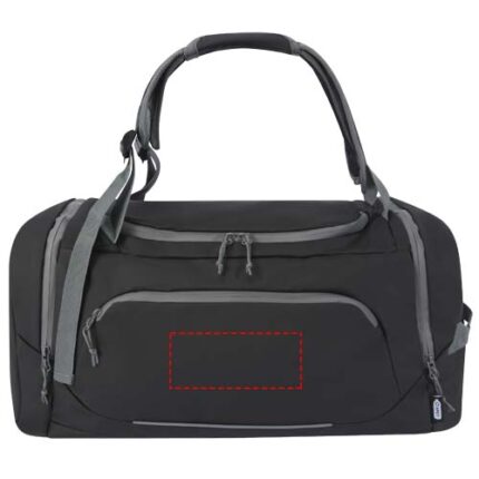 Water-resistant 2-in-1 duffel backpack made from GRS certified recycled materials, including the zips. It features a spacious main compartment with U-shaped opening for easy storage and access, two side zipped pockets (including a compartment for shoes), one zipped front pocket, a mesh water pocket on the back, and reflective piping for visibility. This bag can be carried in 3 different ways: By hand, over the shoulder, or as a backpack with its padded and adjustable shoulder straps. The GRS recycled materials include the main fabric, lining, webbing, and zips. Capacity: 35 litres. PVC free.