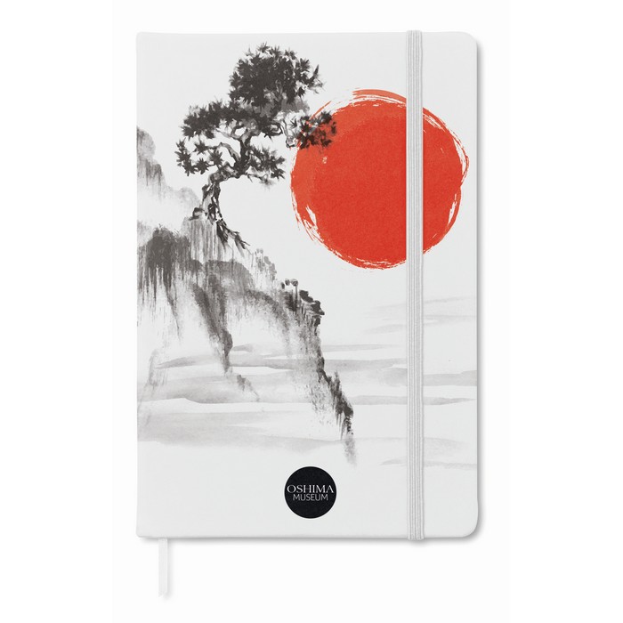 A5 notebook with hard PU cover. Casebound. 192 lined pages (96 sheets). Matching elastic closure strap and ribbon page-marker.