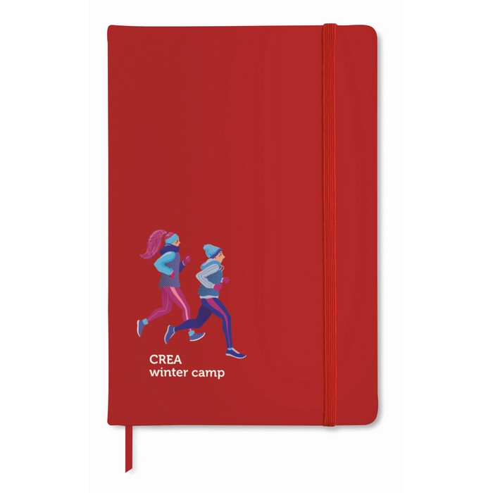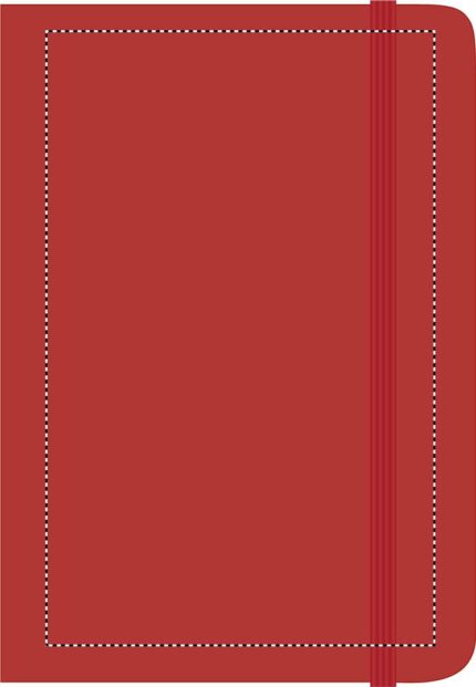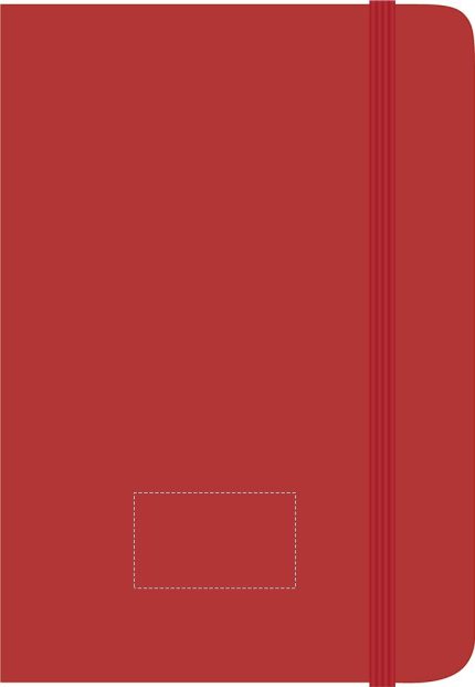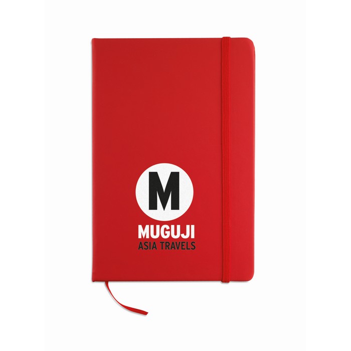 A5 notebook with hard PU cover. Casebound. 192 plain pages (96 sheets). Matching elastic closure strap and ribbon page-marker.