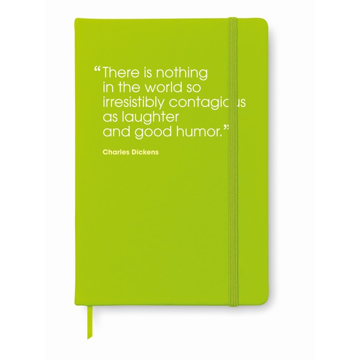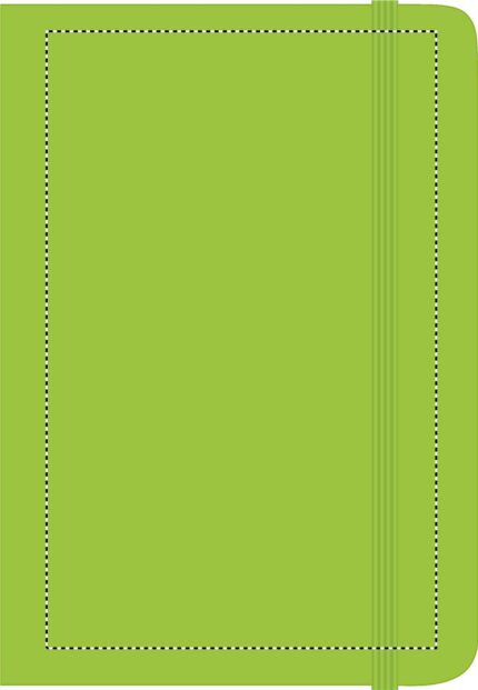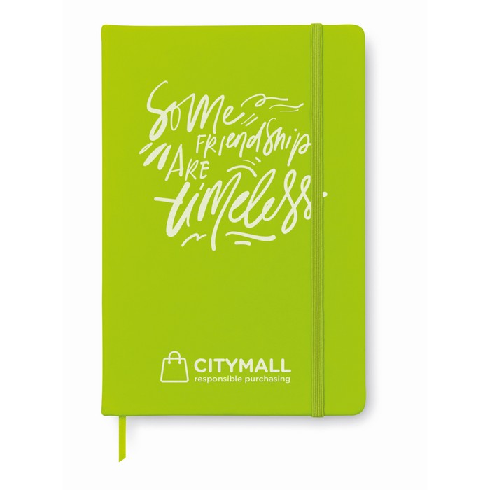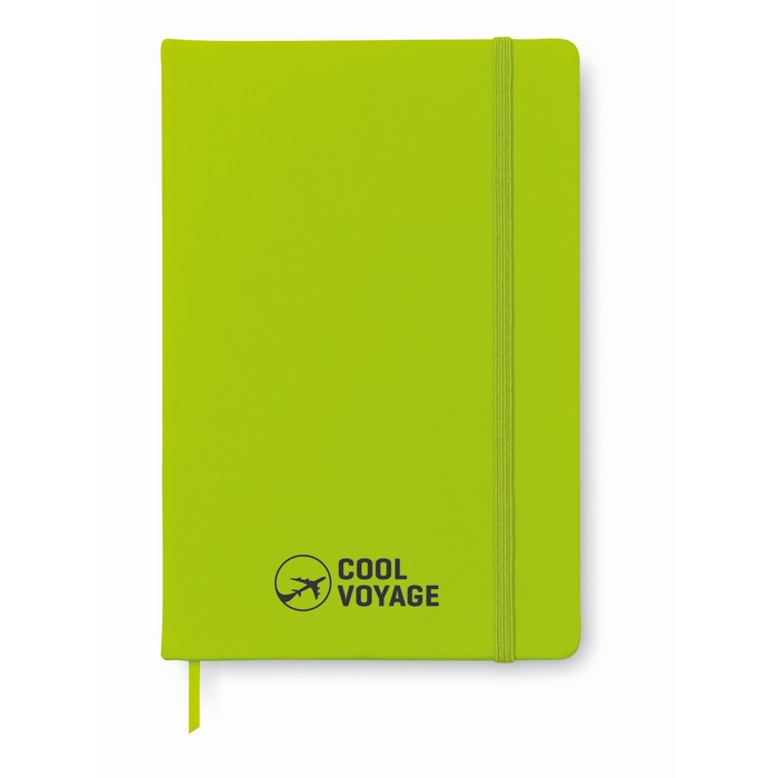 A5 notebook with hard PU cover. Casebound. 192 plain pages (96 sheets). Matching elastic closure strap and ribbon page-marker.
