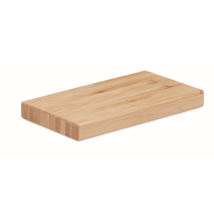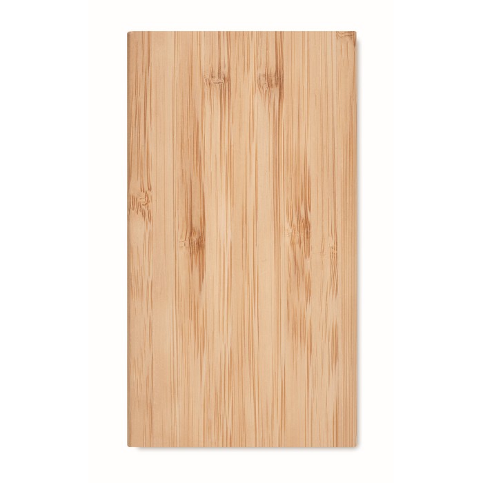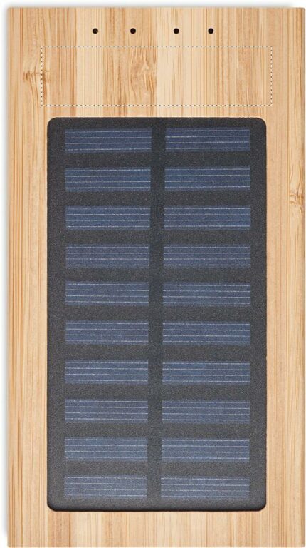Power bank 4000 mAh in Bamboo and solar panel. Capacity for smartphone use, 2 USB output DC5V/1A. Includes indicating light and USB cable with micro usb plug.