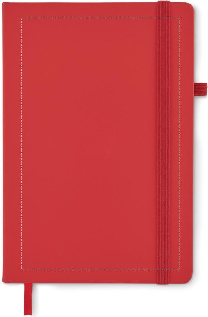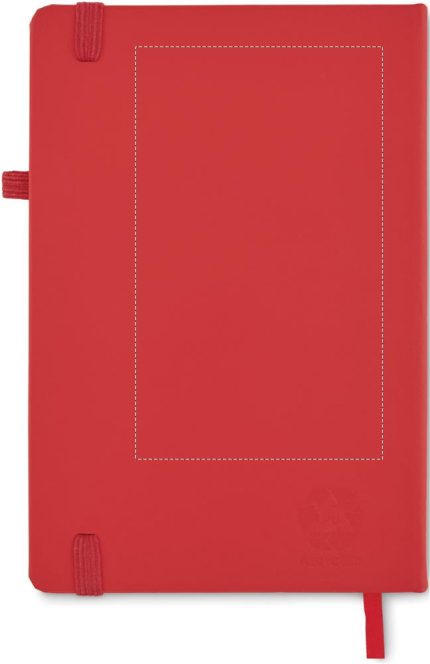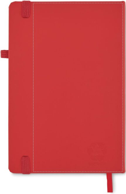 A5 notebook with recycled PU cover. Casebound. 192 recycled paper lined pages (96 sheets). Matching elastic closure strap and ribbon page-marker and pen holder.