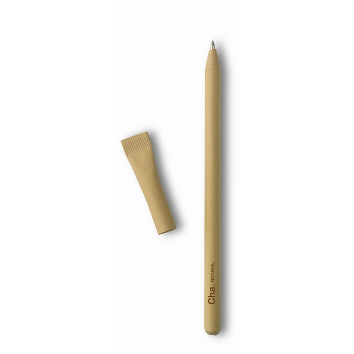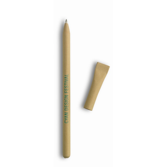 Ball pen with cap entirely made from recycled paper with blue ink refill.