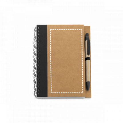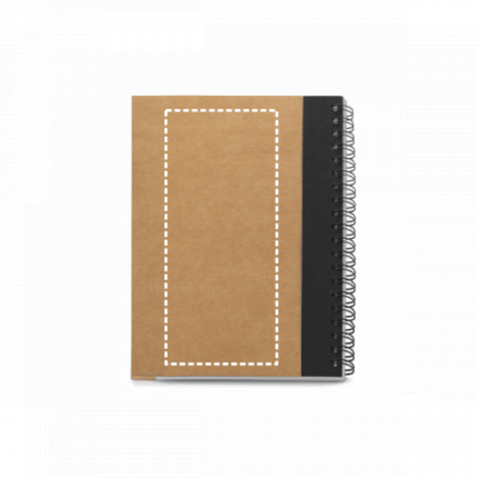 B6 spiral-bound notepad with 120 plain recycled pages and kraft hardcover. This notepad includes a pen holder and ballpoint. 130 x 177 mm