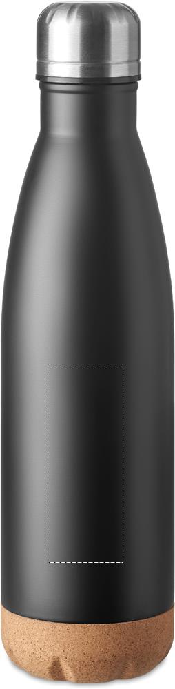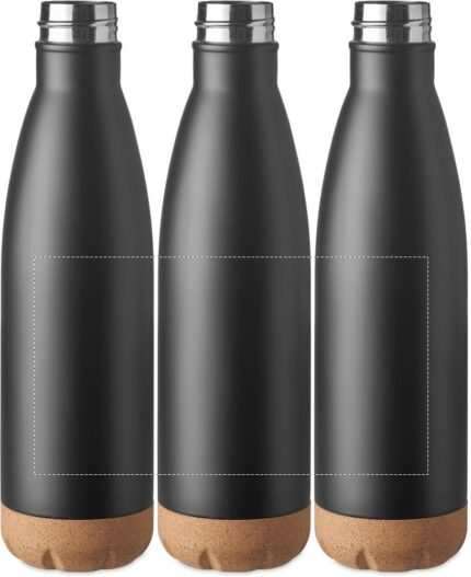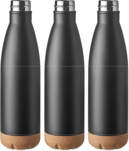 Double wall stainless steel vacuum bottle with cork base detail. Capacity: 500 ml. Leak free.