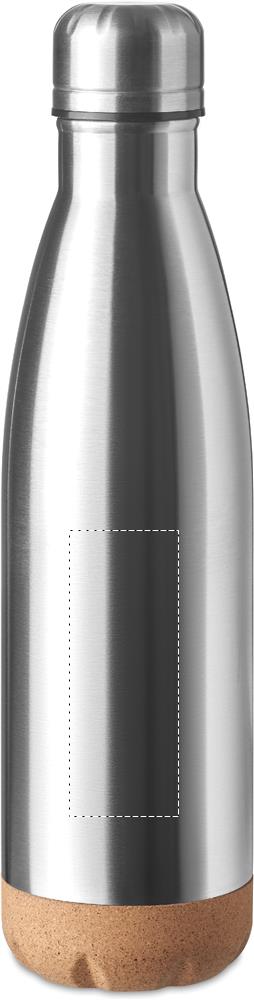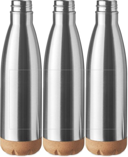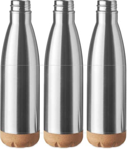 Double wall stainless steel vacuum bottle with cork base detail. Capacity: 500 ml. Leak free.