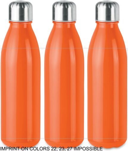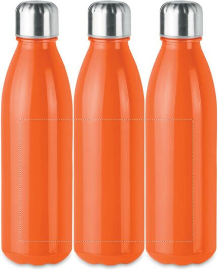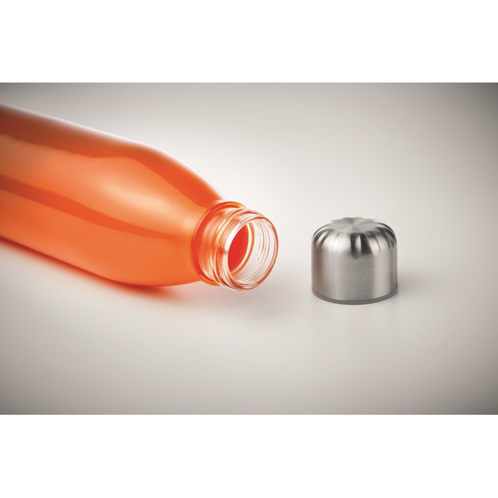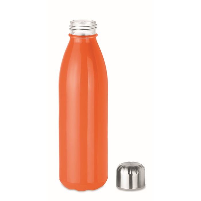 Glass drinking bottle with stainless steel lid. Capacity: 650 ml. Not suitable for carbonated drinks. Leak free.