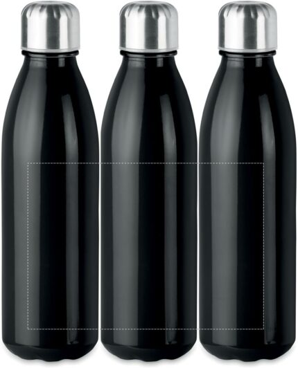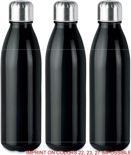 Glass drinking bottle with stainless steel lid. Capacity: 650 ml. Not suitable for carbonated drinks. Leak free.
