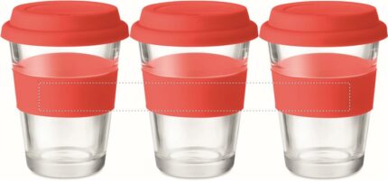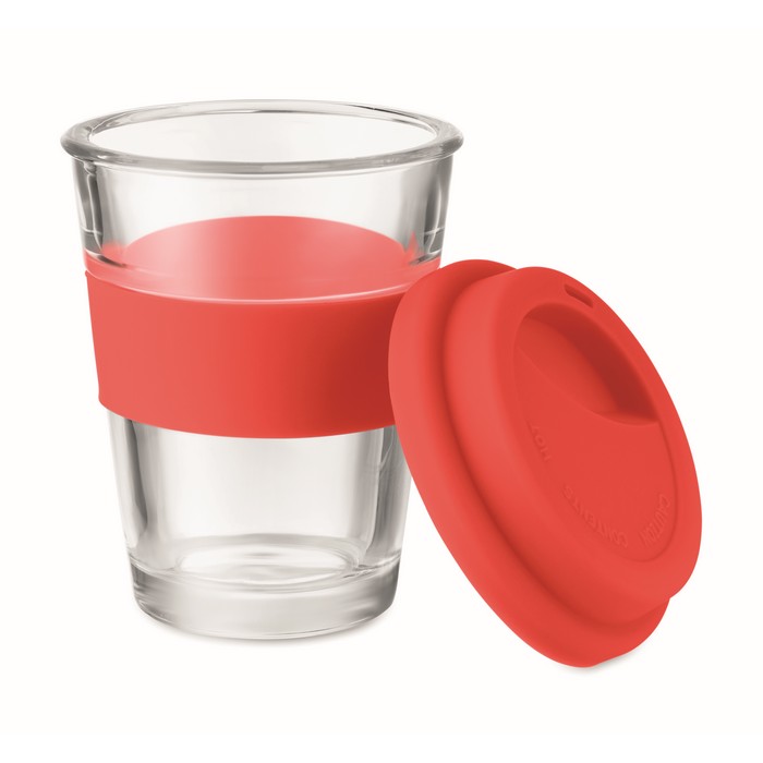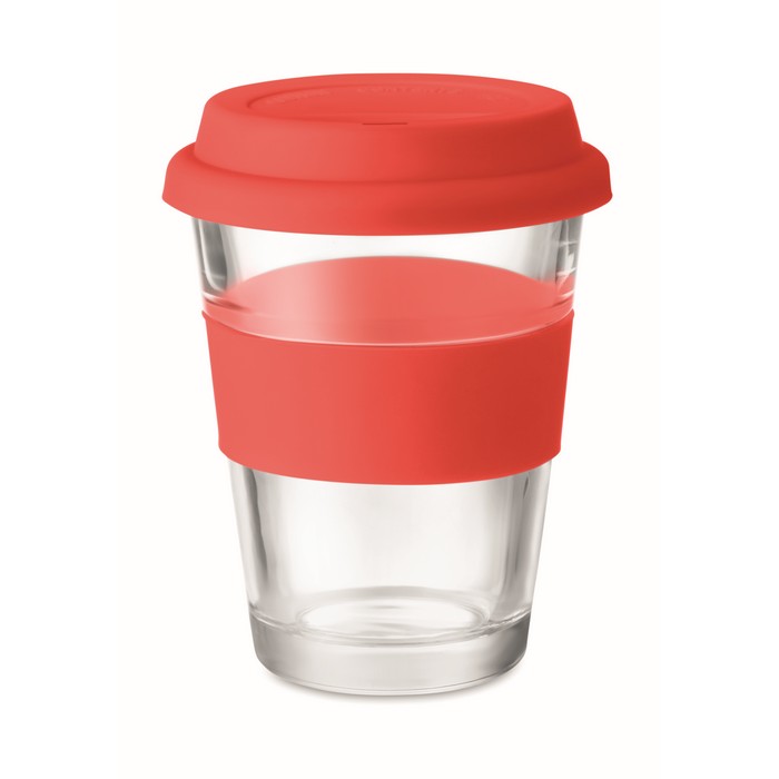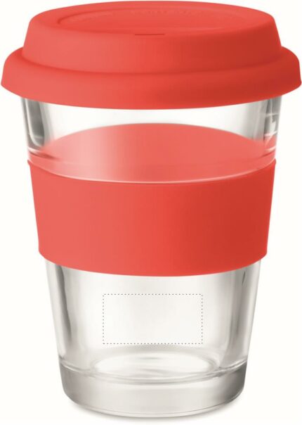 Glass tumbler with silicone lid and grip. Capacity 350 ml. As this is a single wall mug heat transfer can still occur.