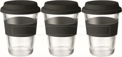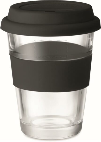 Glass tumbler with silicone lid and grip. Capacity 350 ml. As this is a single wall mug heat transfer can still occur.
