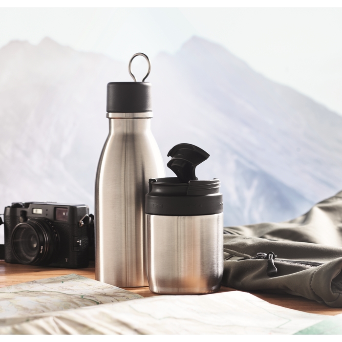 2-in-1 double wall stainless steel vacuum insulated bottle with detachable flip-lid tumbler. Leak free. Capacity: bottle: 500 ml / tumbler: 310 ml.