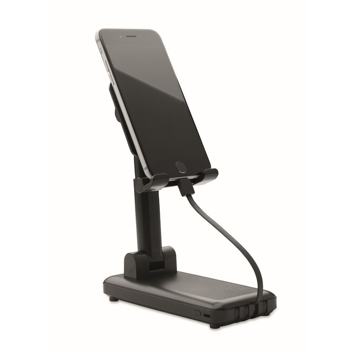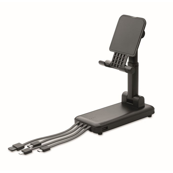 Power bank 10000 mAh in ABS with extendable and foldable phone holder. Integrated multi cables. Output: DC 5V/2A.