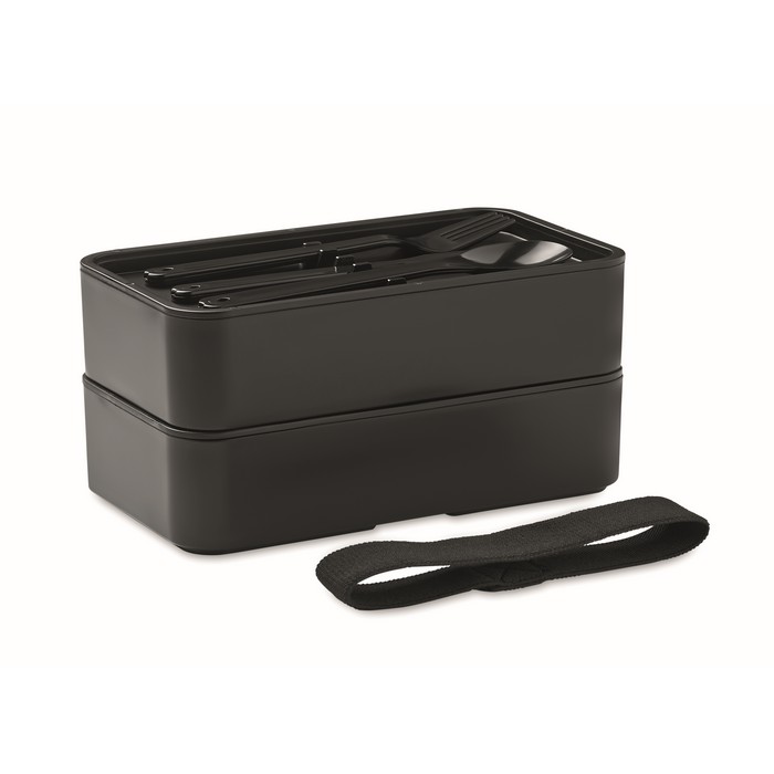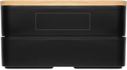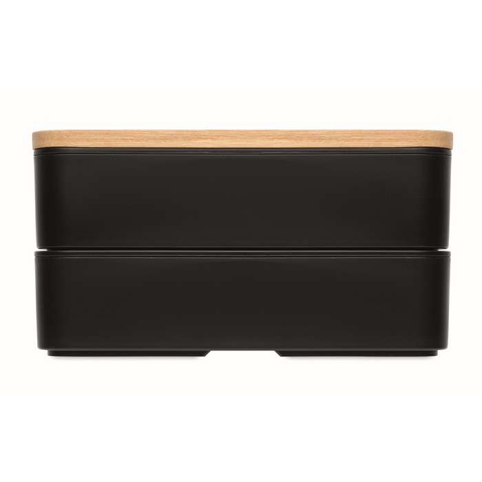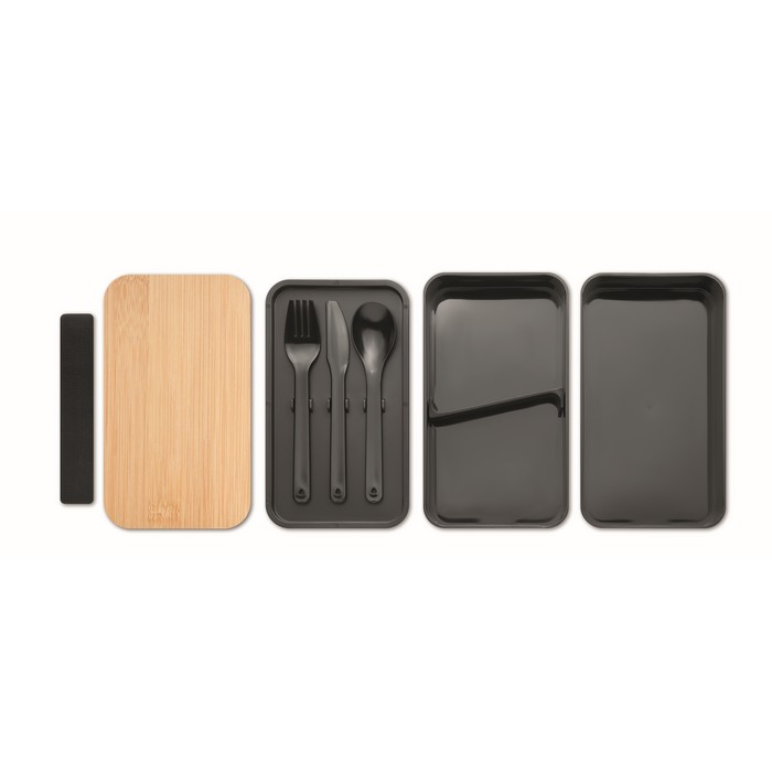 PP two-tier lunchbox with bamboo lid including 1 removable PP divider and 3 cutlery utensils with attachable polyester band. Capacity 400ml (2x).
