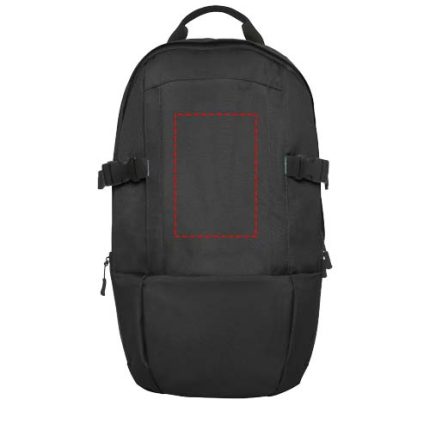 Sustainable GRS certified RPET laptop backpack made with 50% recycled materials. Features a large zippered main compartment with a padded 15″ laptop sleeve with velcro closure, a hanging hook, and a front vertical zippered compartment. Comes with additional straps with buckle closure for safety, comfortable padded shoulder straps, grab handle, mesh back with a zippered pocket and expandable mesh side pocket.