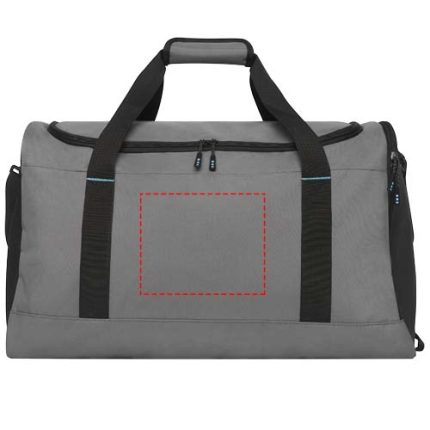 Sustainable GRS certified RPET duffel bag made with 55% recycled materials. Features a large zippered main compartment, a reinforced base panel, a side mesh pocket, and an expandable wet/dry zippered pocket. Comes with a small zippered internal pocket for organization, removable and padded shoulder strap, grab handles with padded velcro closure, and an extra grab handle on the bottom right side.