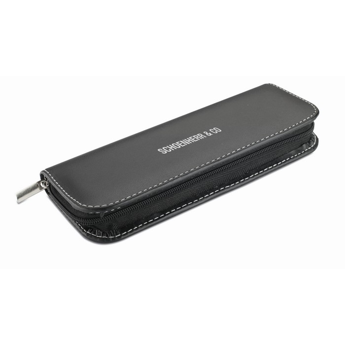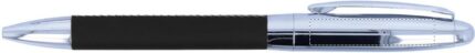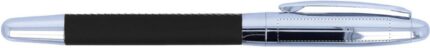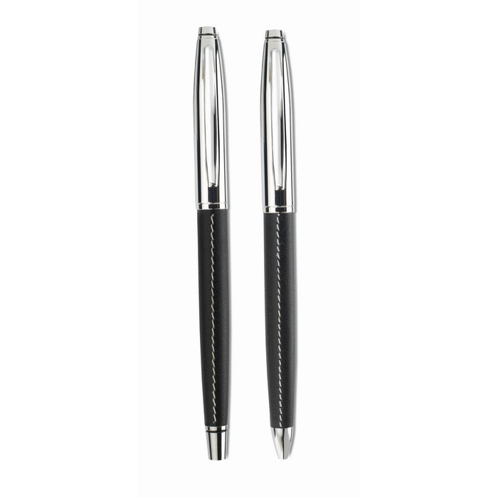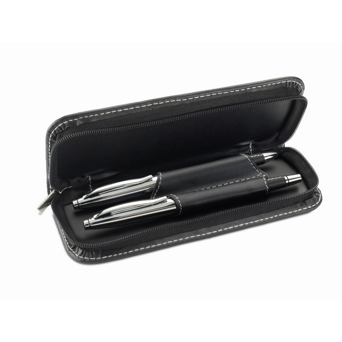 Metal pen set with ball pen and roller ball, presented in a zipped PU leather pouch in matching colour and contrasted stitching. Blue and black ink respectively.