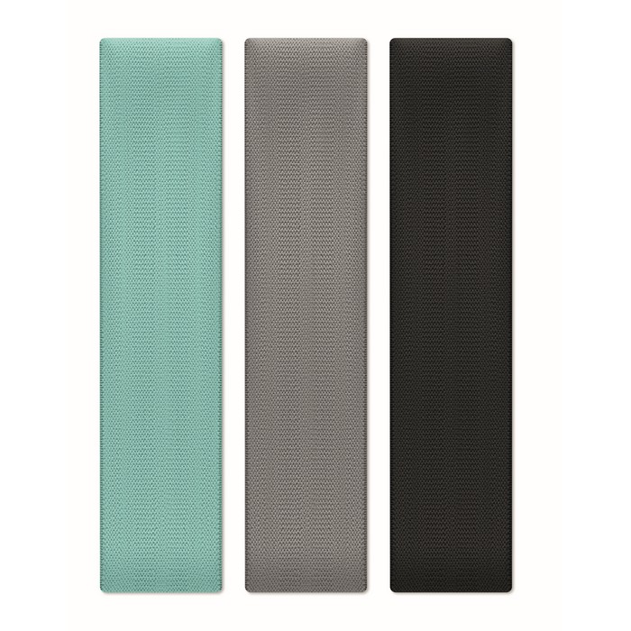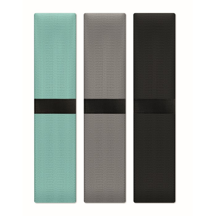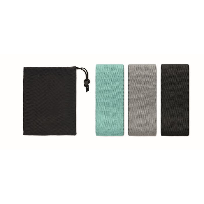 Set of 3 fitness bands in terylene, cotton and latex silk in an RPET pouch. Fitness bands all have a different strength for optimal training.