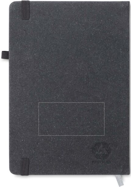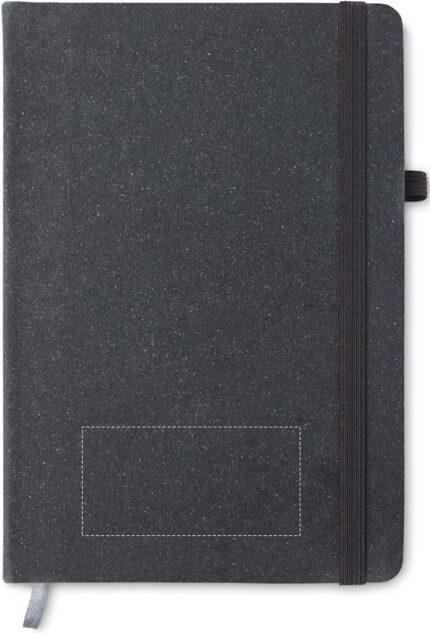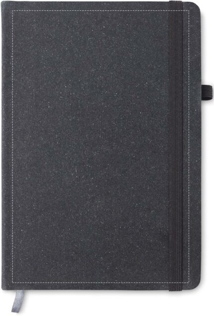 A5 notebook with hard recycled PU cover. Comes in two cover colours – natural and black. Casebound. 160 lined pages (80 sheets). Matching elastic closure strap and pen holder.