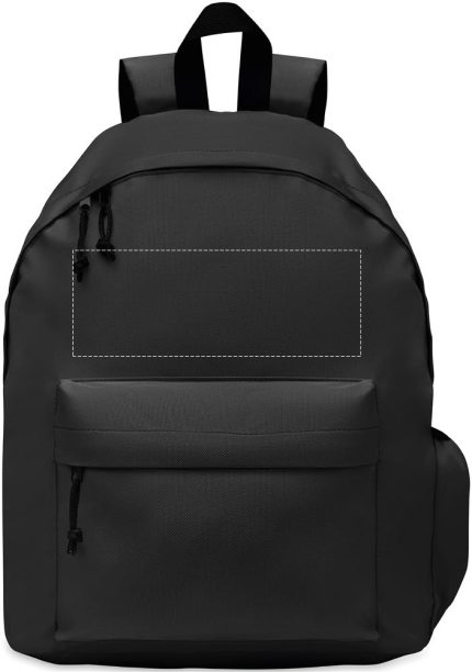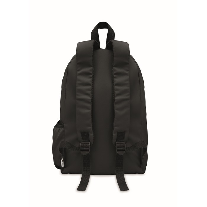 Backpack in 600D RPET polyester with outside pocket with zipper. Padded back and has a side bottle compartment.