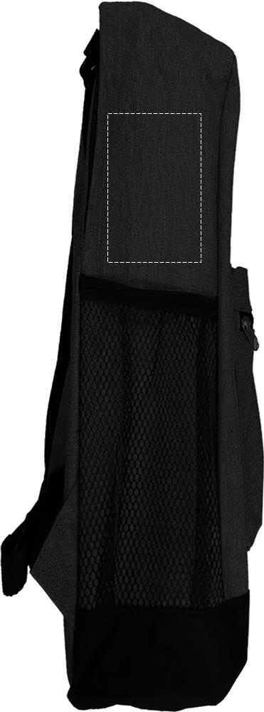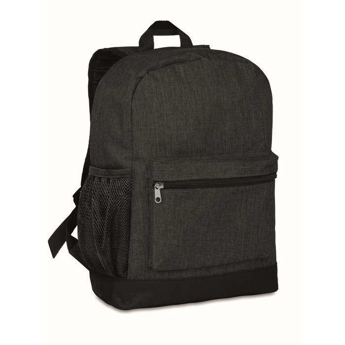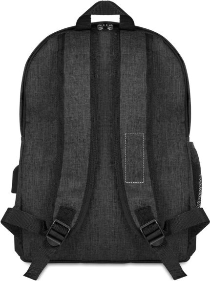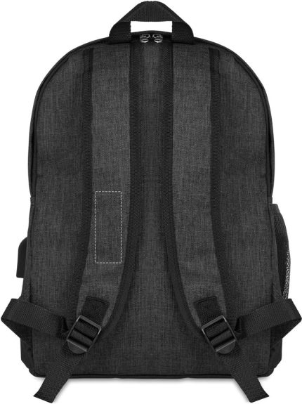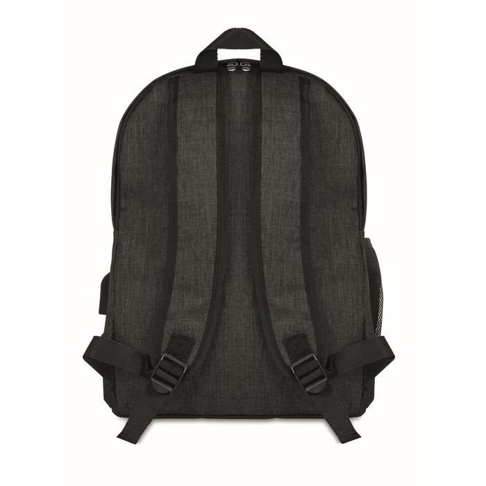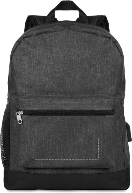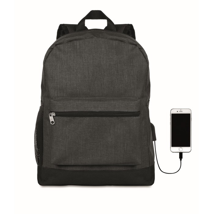 600D 2 tone Polyester backpack padded. Including an internal RFID anti skimming compartment and phone compartment. Including mesh pocket for your bottle or umbrella. Zipper main compartment on backside for better protection. Additional empty plug on the side where you can put your cable through and connect to your own power bank.