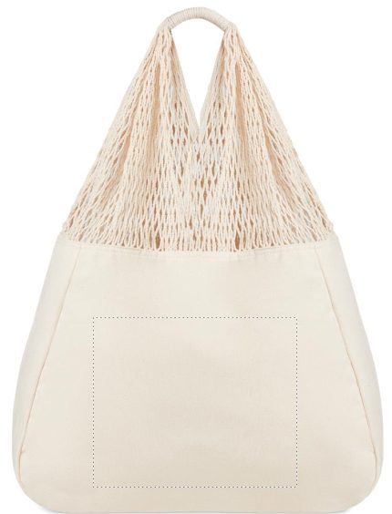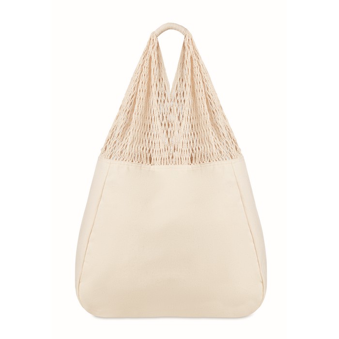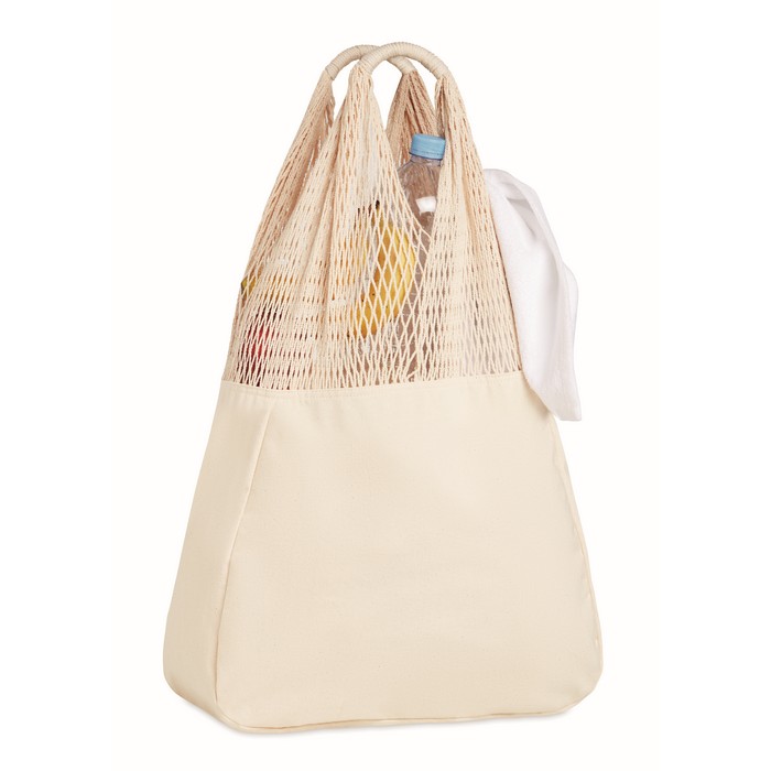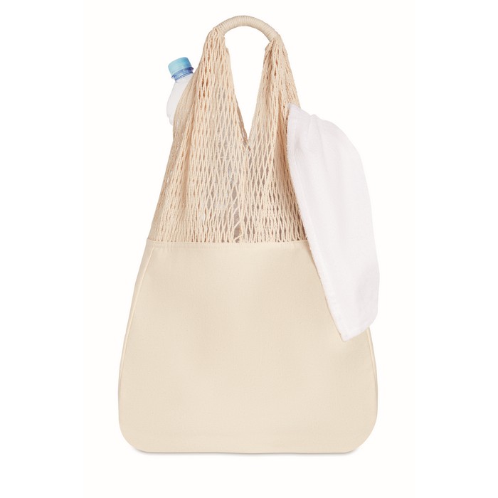 Beach bag in cotton and mesh with long handles. 220 gr/m².