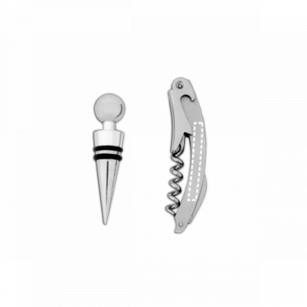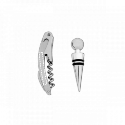 Zinc wine set. Includes corkscrew with sommelier knife and stopper. Supplied in a gift box. 103 x 133 x 28 mm