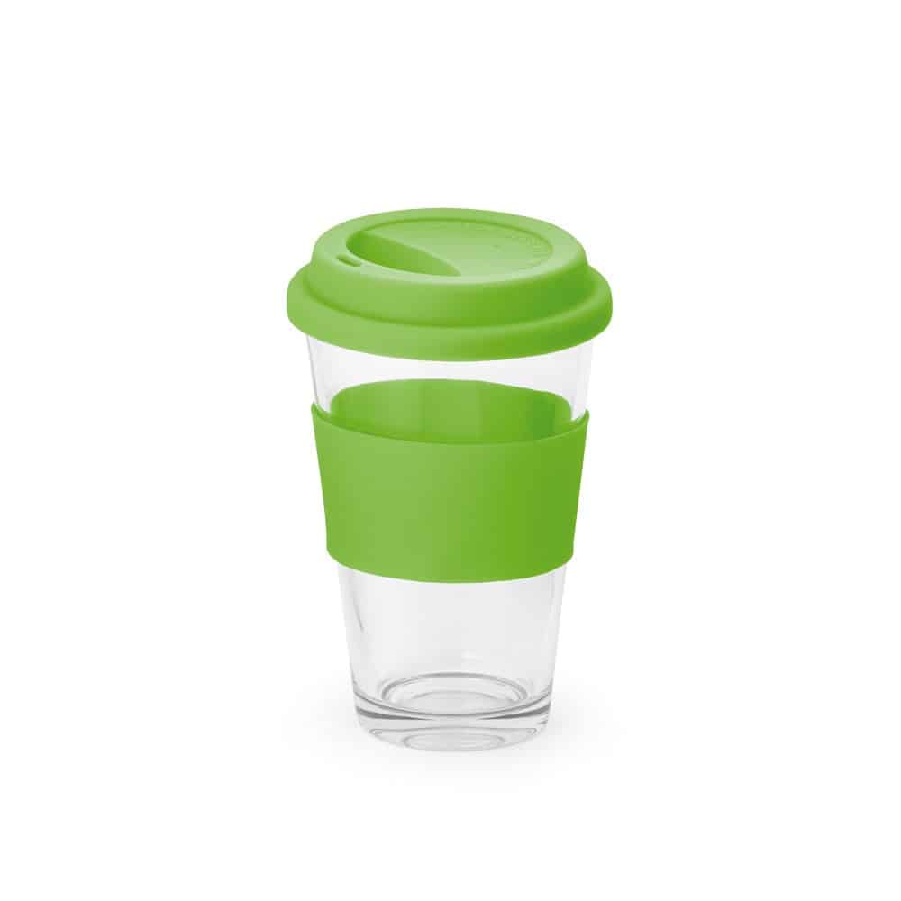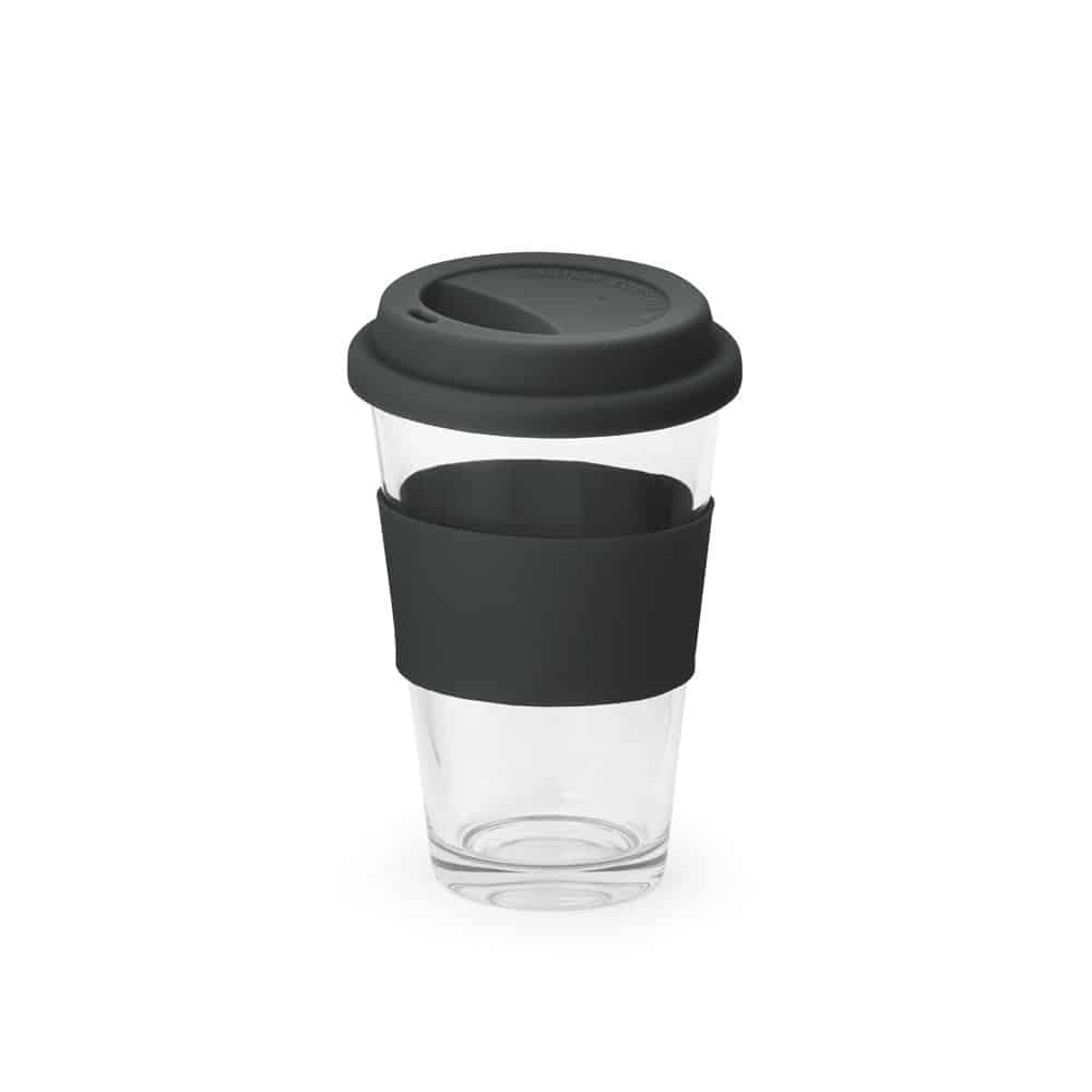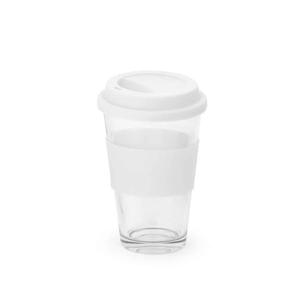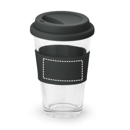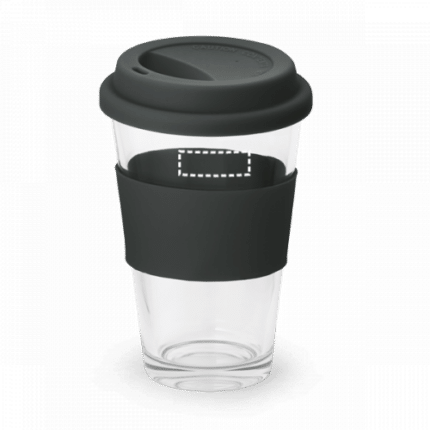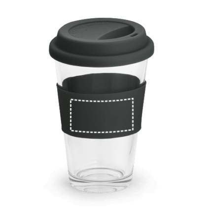 Glass travel cup with volume-capacity of 330 mL. The cup contains a silicone band to facilitate the transport of hot drinks. Heat transfer can occur. ø80 x 125 mm