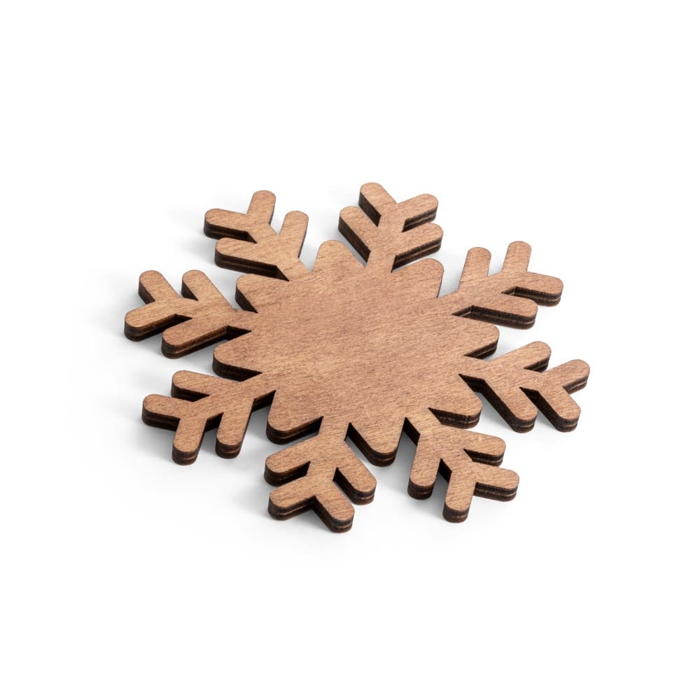 Set of 4 plywood snowflake shaped coasters. Supplied in a kraft paper gift box. 100 x 100 x 5 mm | Box: 105 x 105 x 20 mm