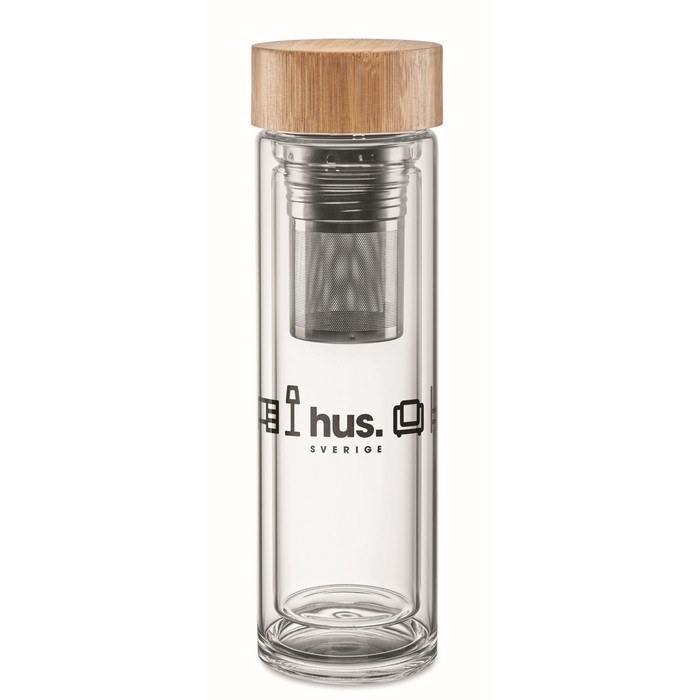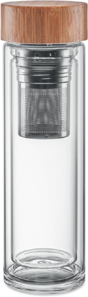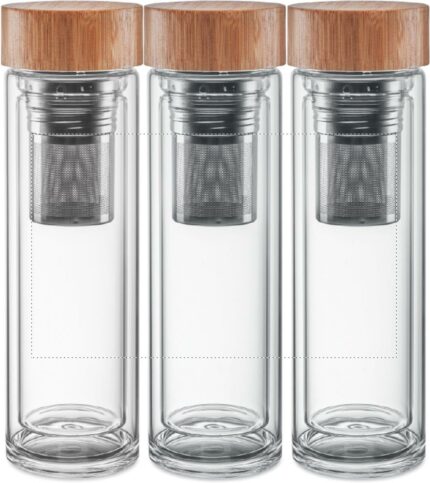 Double wall in high borosilicate glass bottle and bamboo lid with tea infuser. Capacity: 400 ml. Bamboo is a natural product, there may be slight variations in colour and size per item, which can affect the final decoration outcome. Leak free. Laser engraving is not possible on borosilicate glass.