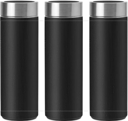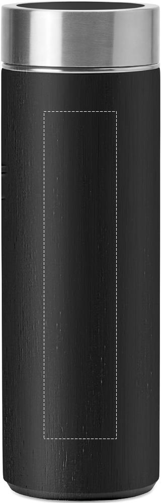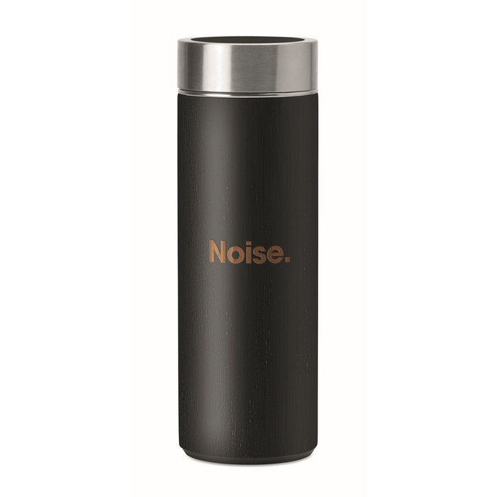 Double wall stainless steel insulating vacuum flask with bamboo cover and additional tea infuser. Capacity: 400 ml. Bamboo is a natural product, there may be slight variations in colour and size per item, which can affect the final decoration outcome.