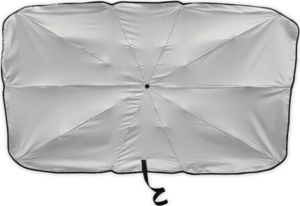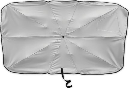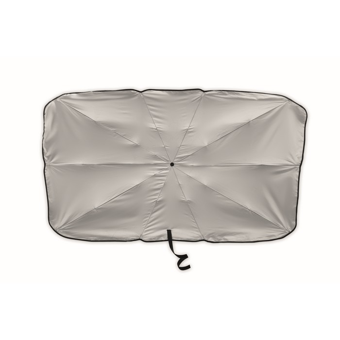 Windshield sun shade car umbrella in 190T pongee with 1 side silver UV (SPF50) lining. Manual open/close.