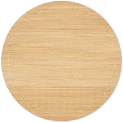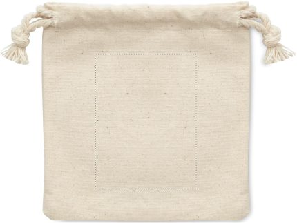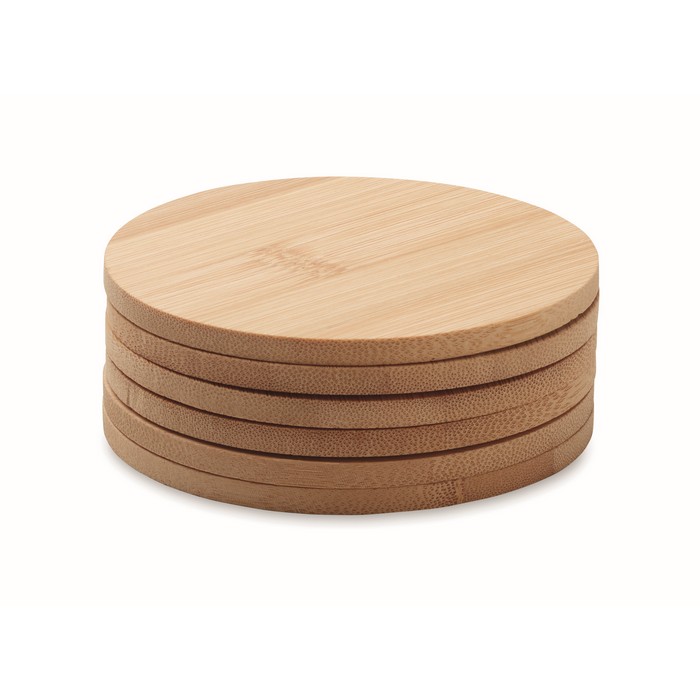 Set of 6 round bamboo coasters presented in a cotton drawcord bag.