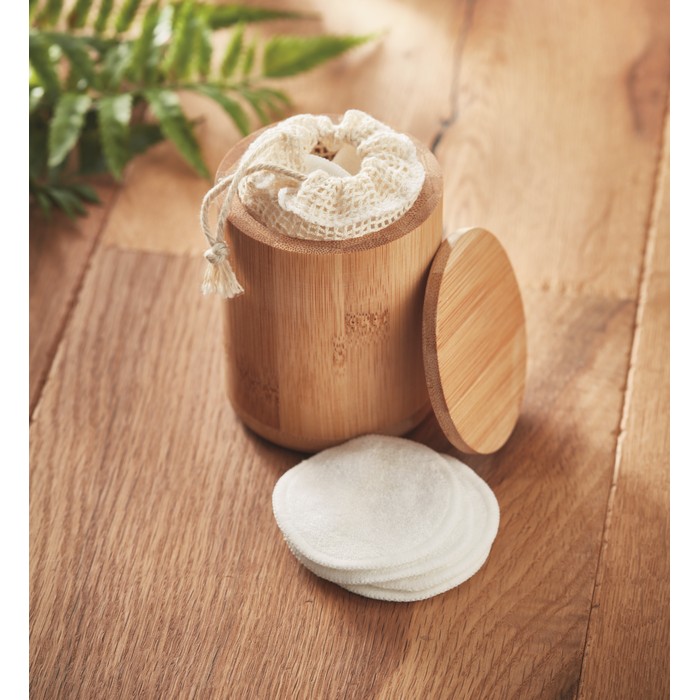20 reusable cleansing face pads in bamboo fibre presented in bamboo box. Includes a cotton mesh bag ideal for use when washing the pads.