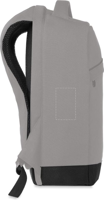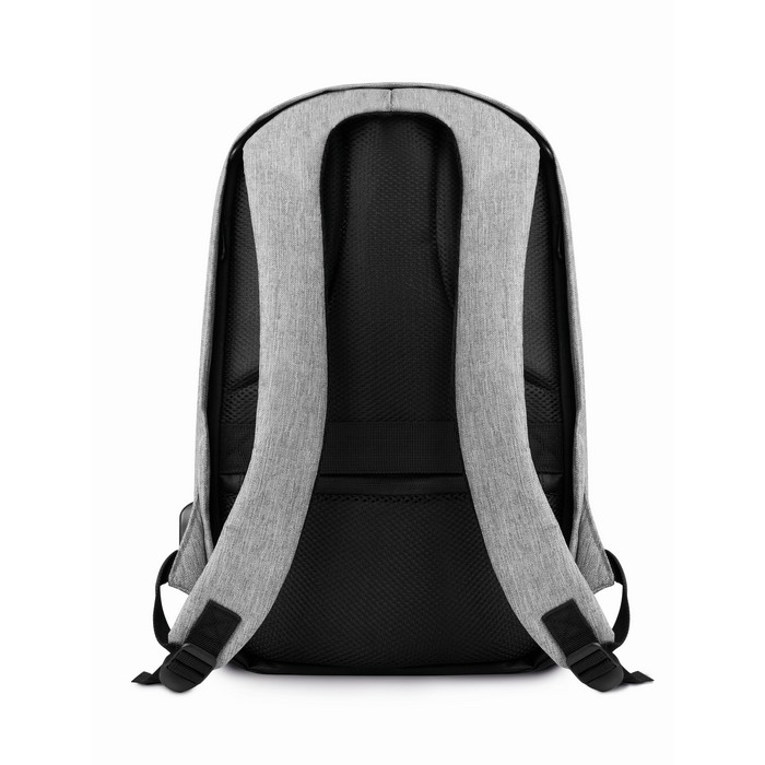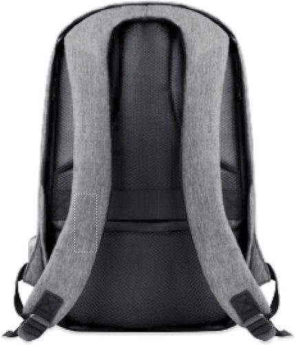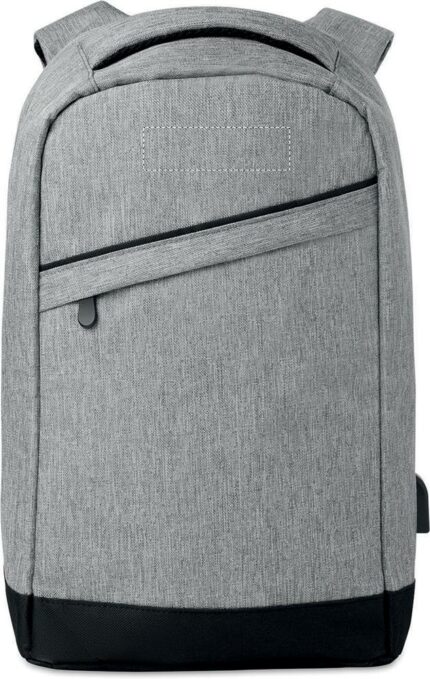 600D 2 tone Polyester backpack with padded shoulder strap with main internal compartment. Includes one internal 13” laptop compartment and an USB charging cable. Zipper main compartment on backside for better protection.
