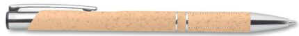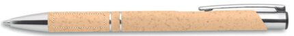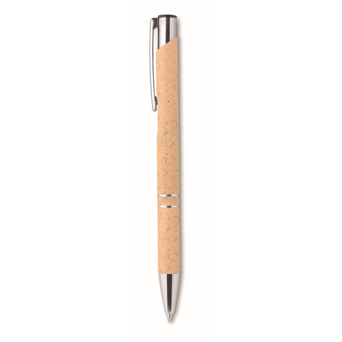 Push button ball pen in 50% wheat straw and 50% ABS material with silver fittings. Blue ink.