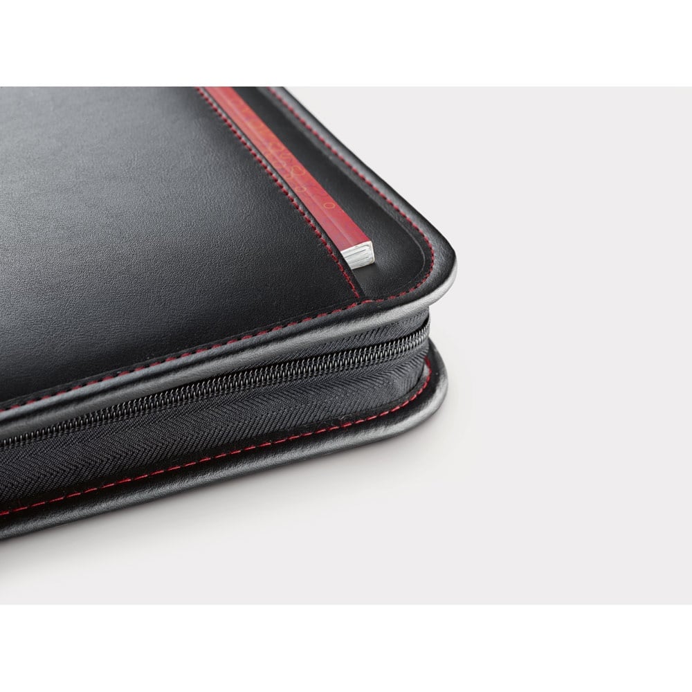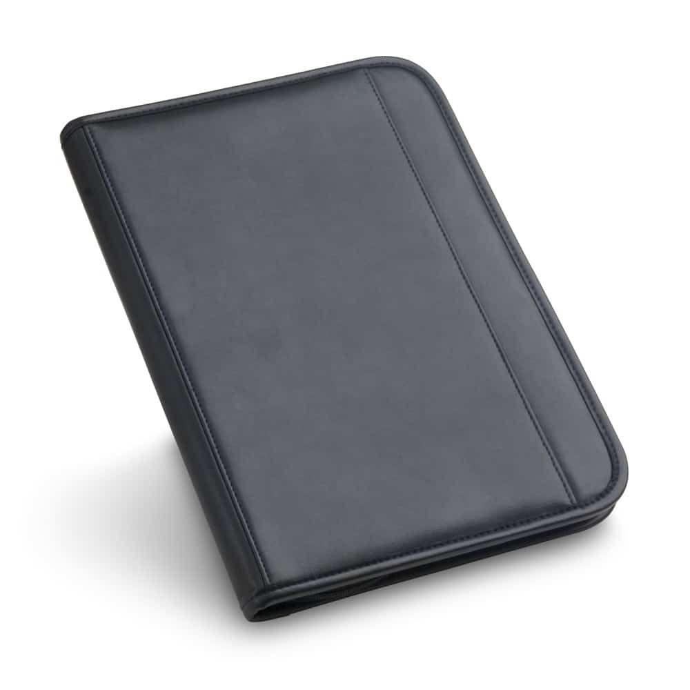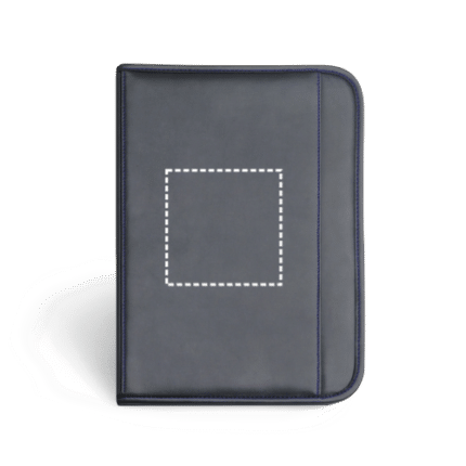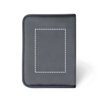 A4 folder in imitation leather with front pocket and zipper. Interior features several pockets, a pen holder (pen not included), writing pad with 20 sheet pad with lined paper and an 8-digit dual-power calculator, with a LR1130 battery included. 250 x 345 x 20 mm