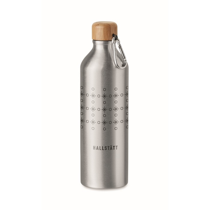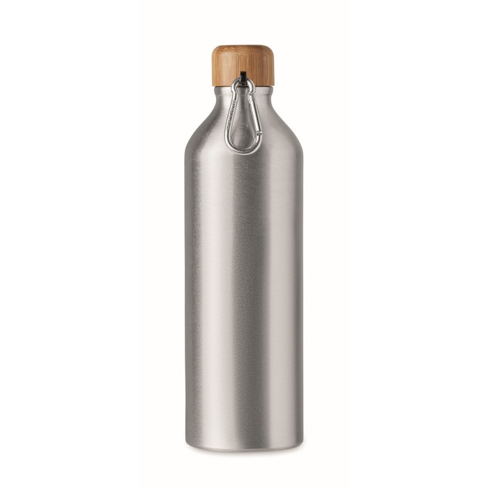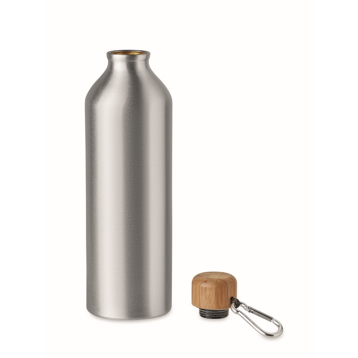 Single wall Aluminium bottle with bamboo lid and carabiner. Capacity: 800 ml. The carabiner is not for climbing (non professional use).